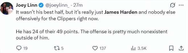 快船记者Joey Linn:这并不是哈登表现最好的上半场,但对于糟糕的快船来说是,进攻端全靠他一人,其他人根本无法提供半分帮助。